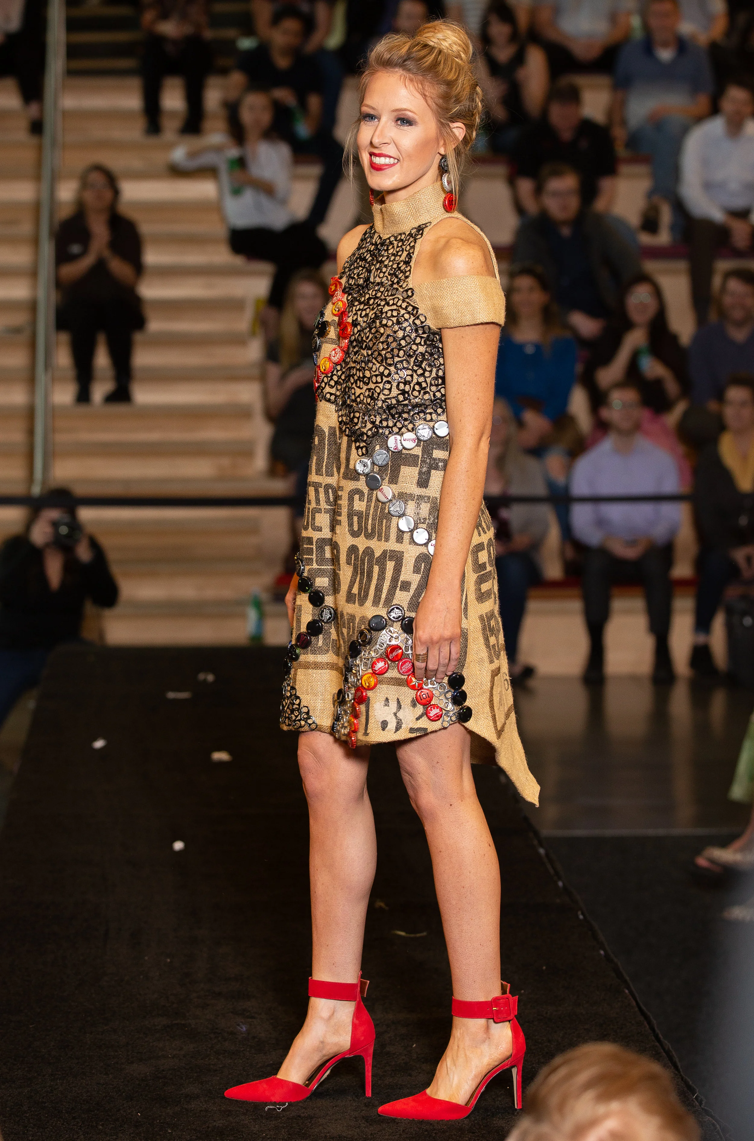 Our inspiration for this garment was focused on local Dallas energy. And what gives this city the most amount of energy is our morning cup of coffee and after-hour drinks to close out the night. The base of our dress is made from recycled burlap sacks from a local coffee roastery; and our recycled taps and caps are all from locally owned breweries.